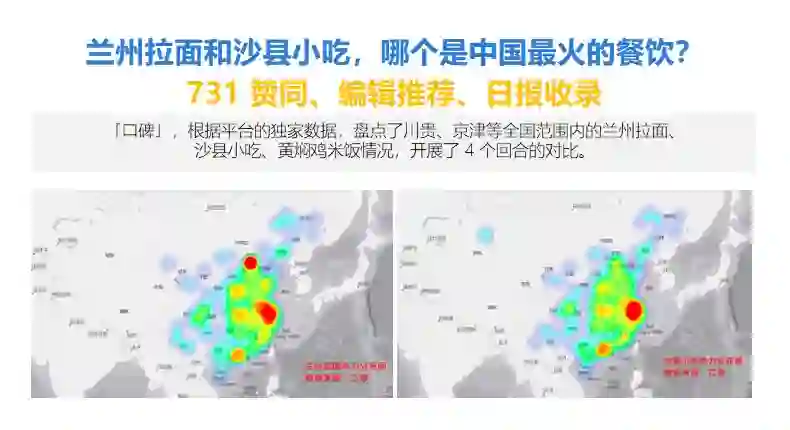 口碑曾经做过一个“关于兰州拉面和沙县小吃,哪个是中国最火的餐饮?”的回答,根据平台的独家数据,盘点了川贵、京津等全国范围内的兰州拉面、沙县小吃、黄焖鸡米饭情况,开展了4个回合的对比。