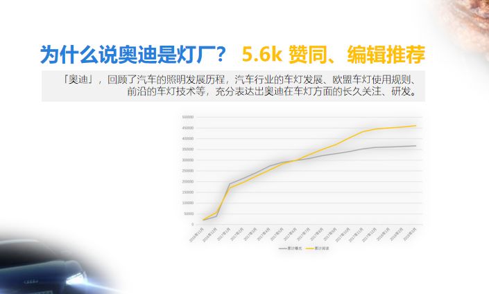 另一个例子来自奥迪,回答了“为什么说奥迪是灯厂?”的问题,收获了5.6k赞同以及编辑推荐。