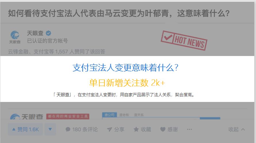 前段时间,“支付宝法人变更意味着什么?”这个问题在知乎掀起了很大的讨论热潮,天眼查在支付宝法人变更的回答里,用自家产品跟知友分享支付宝法人关系,这种与自己的产品契合高、对知友有帮助的热点,就是一种可取的方式。