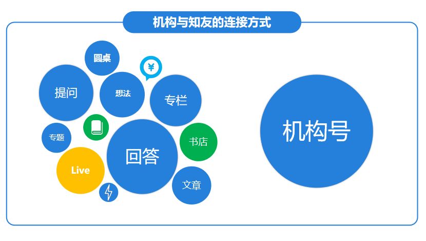 下图清晰地表明了机构与知友的连接方式:包括文章、专栏、圆桌、提问、想法、回答、Live等等。