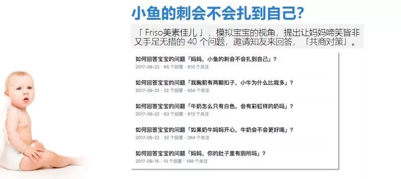 做奶粉的企业Friso美素佳儿模拟了宝宝的视角,提出了让妈妈啼笑皆非又手足无措的40个问题邀请知友来回答,「共商对策」。