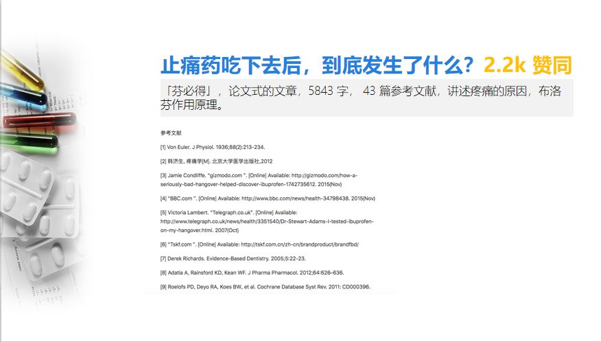 这篇文章用了43篇参考文献,最后收获了2.2k赞同。在读这篇文章的过程当中,用户会真正意识到芬必得在对待疼痛时很用心、很专业,对健康有保障。