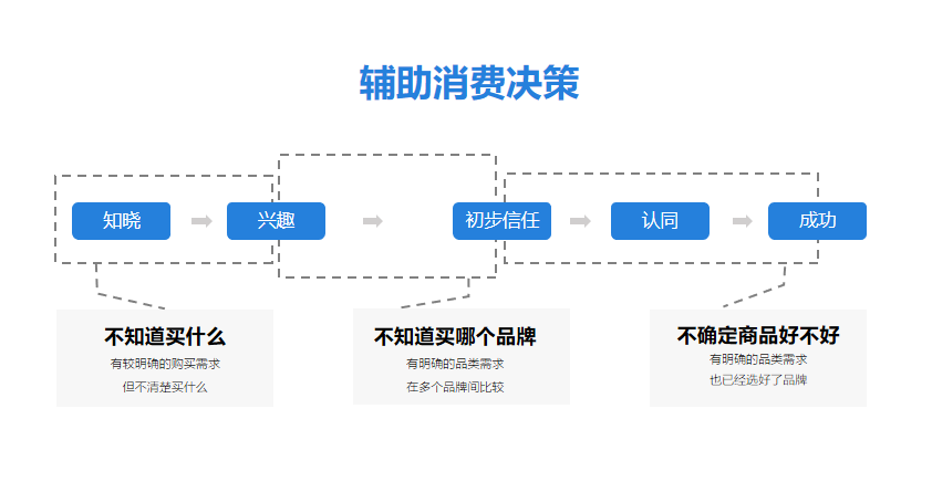 通常来讲,消费决策的路径主要分为以下几个阶段:首先是知晓,接着有了兴趣,后来有初步的信任,然后产生深深的认同,最后是购买和转化的过程。