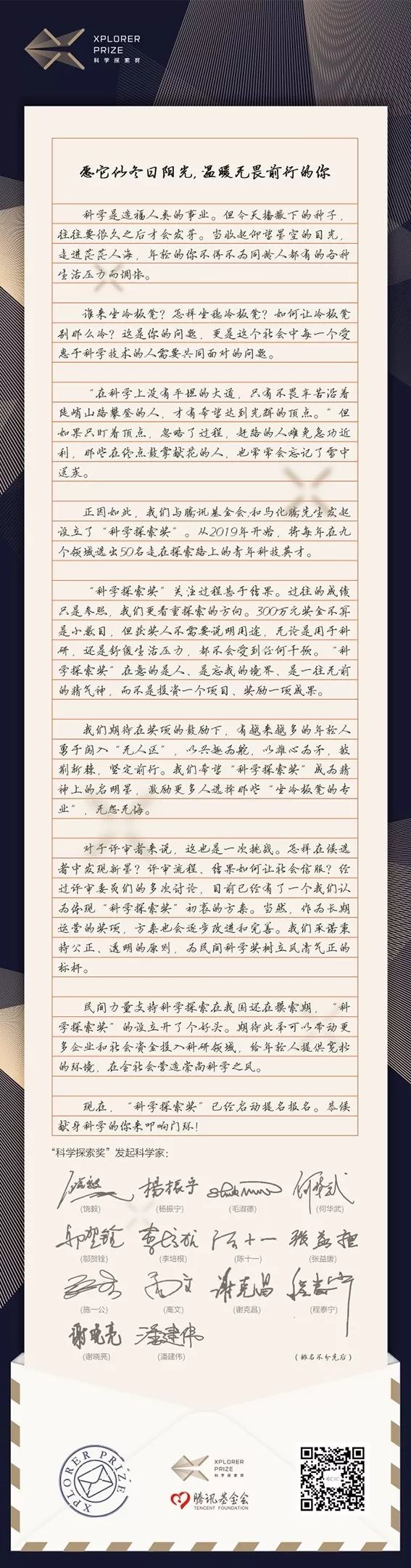 14位发起科学家今天还发表了一封公开信,寄语青年科技工作者: