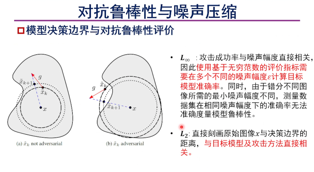 韩教授比较了对抗攻击中两种评价策略。其中基于无穷范数的评价策略在定量噪声幅度下计算攻击方法的攻击成功率。二范数则计算攻击成功所需的最小噪声幅度。通过从对抗空间和集合论两方面的分析可得出结论,基于无穷范数的评价策略能找到的对抗样本是二范数评价策略能找到的对抗样本的真子集,因此在不引入额外限制情况下对噪声幅度的压缩,相对于在人为限定的噪声幅度下判断是否错分,是更优的判断准则。