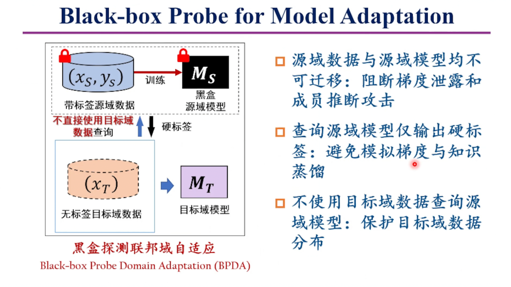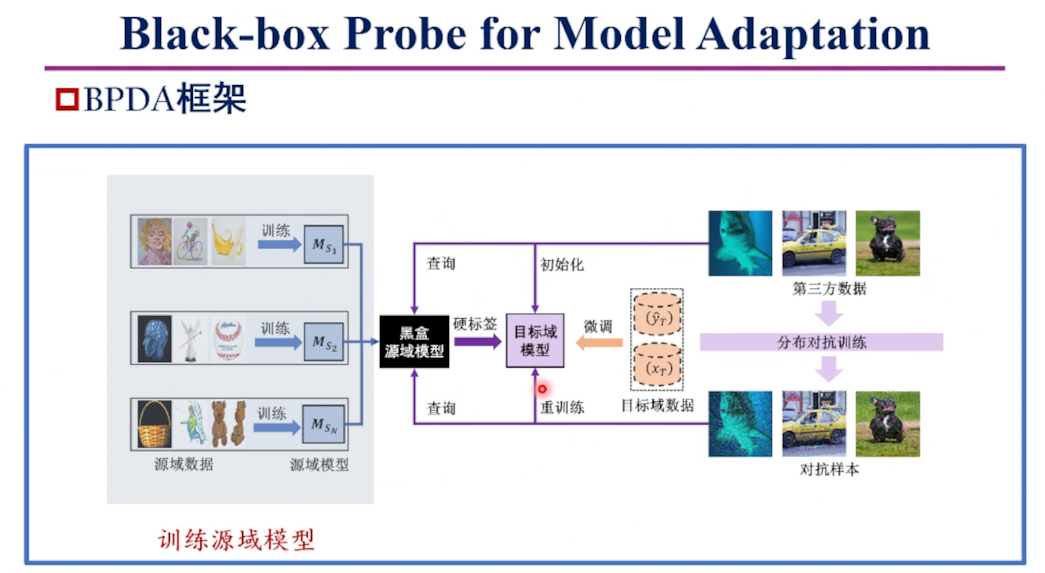 针对该框架,韩教授提出了BPDA域自适应方法,通过分布对抗训练提升黑盒探测效率,可在不传递模型的情况下实现安全的域自适应。