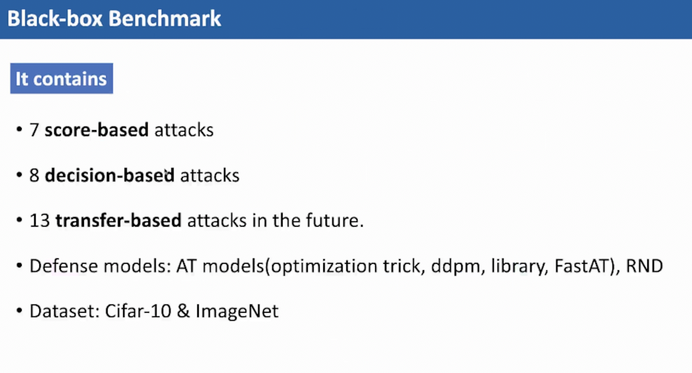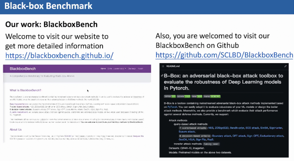 最后,吴教授介绍了一种可用于度量黑盒攻击方法性能的benchmark。这是一个整合了多种攻击方法的工具库,可以帮助人工智能安全领域的学习者快速入门。