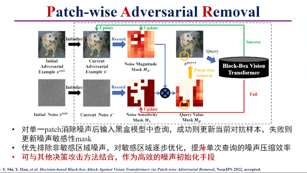第二个工作是针对ViT的决策黑盒攻击。韩教授介绍了ViT和CNN结构差异导致的对ViT进行黑盒攻击的困难。针对现有黑盒攻击方法的问题,韩教授介绍了首个针对ViT模型的黑盒决策攻击方法PAR。PAR使用高斯噪声生成初始对抗样本,使用两个掩模分别记录当前对抗样本的噪声幅度和噪声敏感性,寻找噪声消除价值最高的patch进行压缩。