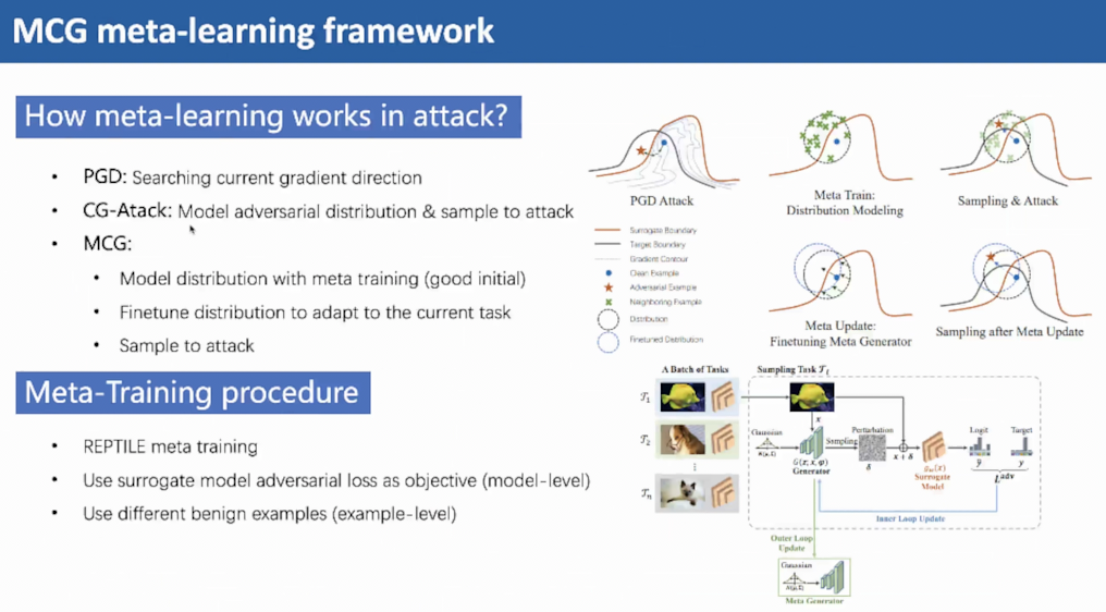 吴教授提出一种基于元学习的MCG方法,使用meta training对对抗样本的分布建模,并且将每次攻击当作一个新的任务,将当前分布对新的任务微调以提升攻击效果该工作发表在TPAMI 2022上。