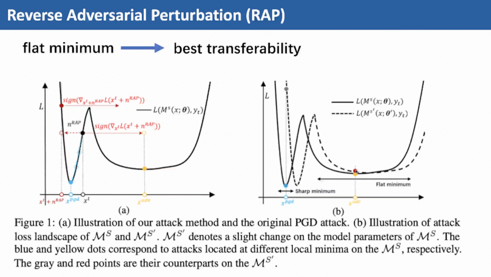 然后,吴教授介绍了一种可有效提升对抗迁移性的通用方法。不同的对抗样本迁移能力差别很大,在flat minimum区域迁移能力较高。