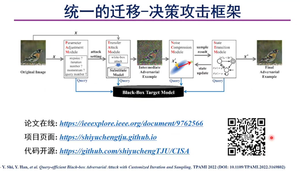 在此基础上,韩教授介绍了两个相互关联的工作。第一个工作是统一迁移-决策黑盒攻击。韩教授首先介绍了现有基于迁移和基于决策的黑盒攻击在模型过拟合、冗余噪声压缩、查询效率低下等方面的问题。针对现有方法的问题,韩教授提出了由四个模组构成的黑盒攻击框架,其中四个模组分别进行参数调整、迁移攻击、噪声压缩和状态转移。
