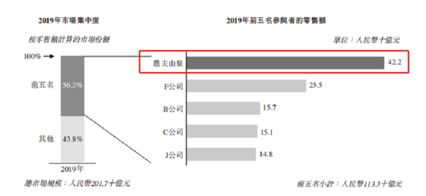 根据全球最大的企业增长咨询公司弗若斯特沙利文的报告,2012年至2019年间,农夫山泉连续八年保持中国包装饮用水市场占有率第一,以2019年零售额计,该公司在茶饮料、功能饮料及果汁饮料的市场份额均居中国市场前三位。
