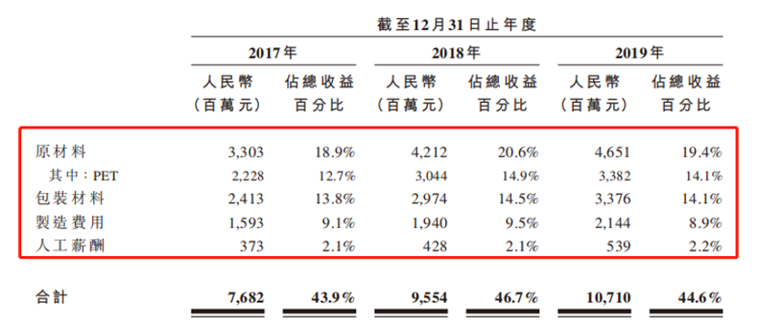 除却水这一直接成本,农夫山泉的主要原材料为生产产品瓶身的PET(涤纶树脂)、糖、果汁等,2017-2019年,该部分成本占到了销售成本总额的43.0%、44.1%和43.4%。另外,包括纸箱、标签及收缩膜等在内的包装材料,在2017-2019年分别占销售成本总额的31.4%、31.1%及31.5%。