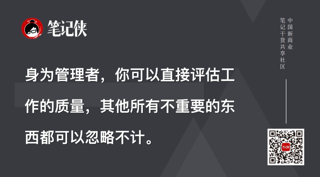 作为管理者,当你没法整天盯着某人的时候,唯一的判断标准就是工作成果。除此之外的一大堆琐碎标准全都不见了。