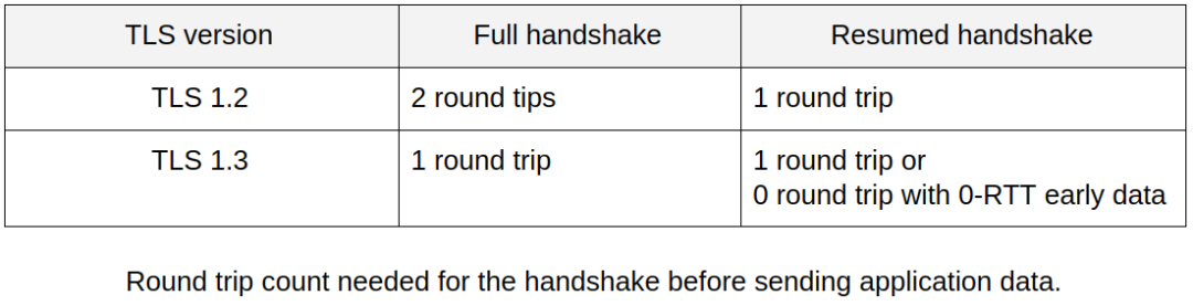 此外,它还有一个针对重新握手的新特性,称为 0-RTT 或 TLS 早期数据。这让应用程序可以在初始握手消息中包含应用程序数据,而不必等到握手完成。