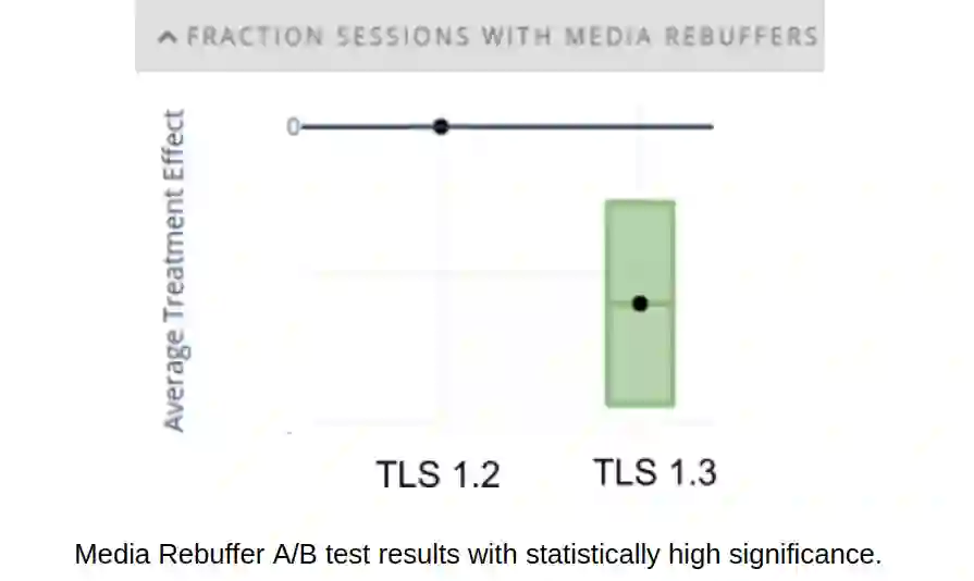 在 Netflix,我们将媒体重新缓冲定义为非网络起点的重新缓冲。其发生通常是由于 CPU 的负载过高导致设备处理媒体数据的速度不够快。与对照组使用的 TLS 1.2 相比,使用 TLS 1.3 的实验组在媒体重新缓冲方面提高了大约 7.4%。