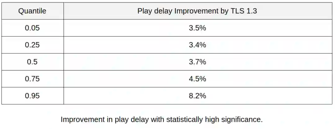 播放延迟是指需要多少时间才开始播放。以下是在实验中测得的播放延迟数据。结果表明,在较慢或拥塞的网络中(即分位数大于 0.75),TLS 1.3 的增益最大,并且在所有的网络条件下都有所改善。