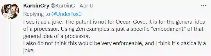 https://twitter.com/Underfox3/status/1511697371020902401?ref_src=twsrc%5Etfw%7Ctwcamp%5Etweetembed%7Ctwterm%5E1511697371020902401%7Ctwgr%5E%7Ctwcon%5Es1_&ref_url=https%3A%2F%2Fdaily-array.com%2Fno-intel-was-not-granted-a-patent-for-the-amd-zen-architecture%2F