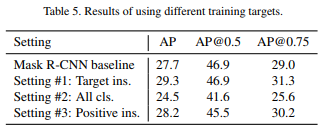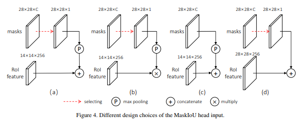 同时作者还做了对比实验,验证不同的MaskIoU输入对性能的影响。文章列举了4种输入方式: