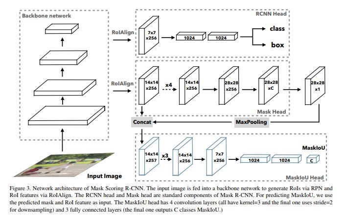 作者在Mask R-CNN的基础上添加了一个MaskIoU分支用于预测当前输出的mask和gt mask的IoU。MaskIoU的输入由两部分组成,一是ROIAlign得到的RoI feature map,二是mask分支输出的mask。两者concat之后经过3层卷积和2层全连接输出MaskIoU。