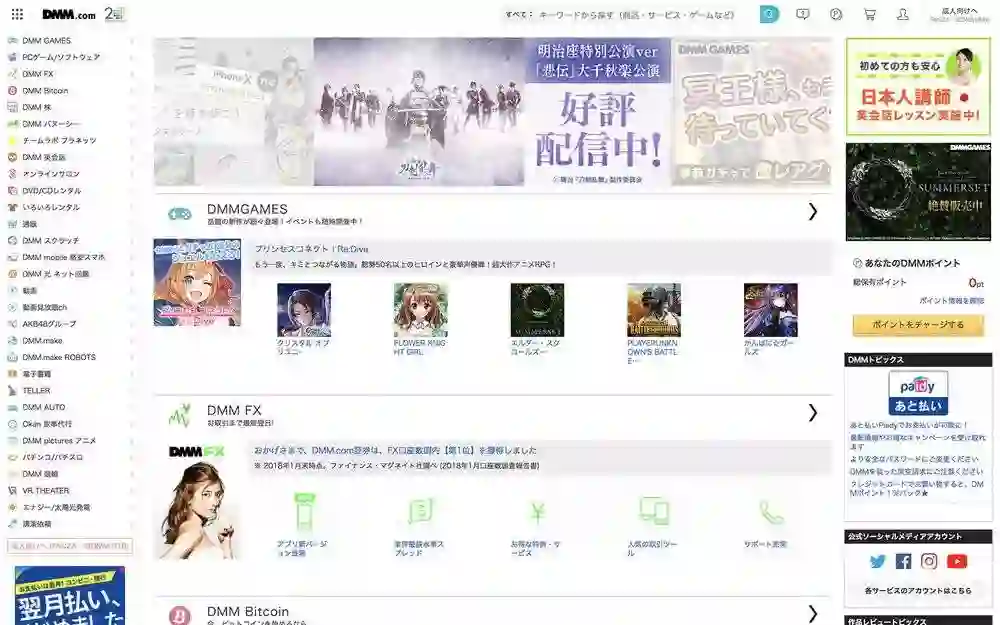 如果我们打开DMM的官网,在左侧我们除了可以看到游戏、视频、电子书、电商等较为常见的互联网公司业务之外,还覆盖到了英语教育、生活用品租赁、外汇交易、赌马、区块链、3D打印、新能源、通信(扯网线)等领域。覆盖业务之广,仿佛一个日本的腾讯。