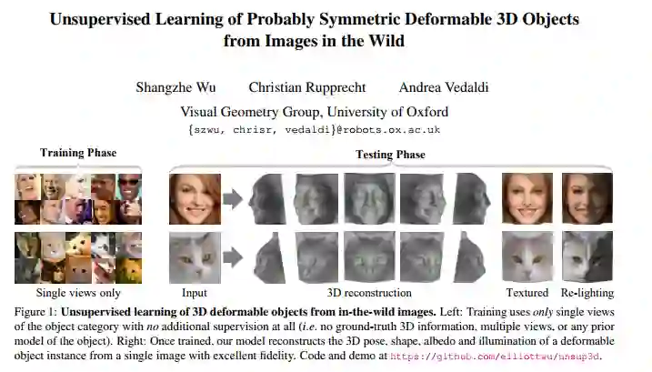 这篇名为《Unsupervised Learning of Probably Symmetric Deformable 3D Objects from Images in the Wild》的论文由牛津大学的吴尚哲、Christian Rupprecht、Andrea Vedak三位合著。