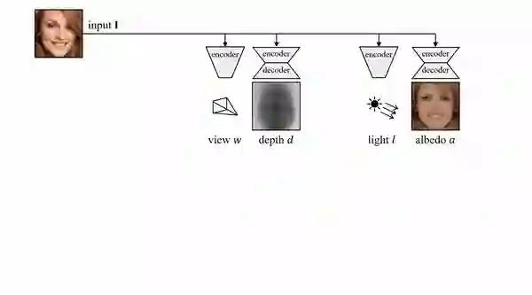 具体而言,其使用的方法是基于一个自动编码器,这个编码器能够将每张输入图像分解为深度、反射率、视点和光照四个组件。整体模型结构如下: