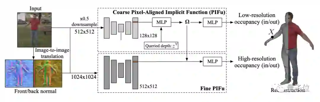 为了得到高分辨率的输出,在这项研究中,研究人员在PIFu的基础之上,额外叠加了一个像素对齐的预测模块。