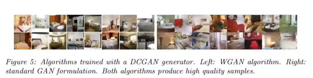 WGAN(左)和 DCGAN(右)生成房子图片的效果对比。WGAN 更稳健,出错更少。