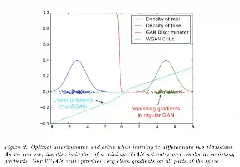 GAN 的判别器和 WGAN 的判别器在学习区分高斯分布数据的情况。GAN 可能会出现梯度消失,但 WGAN 在空间内始终保持稳健的梯度变化。