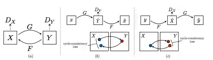 F 也进行类似的操作,即从 Y 中得到一张图像,并尝试将其映射到 X 中的某个图像。判别器 D_X 预测一张图像究竟是由 F 生成的还是 X 中的真实图像。