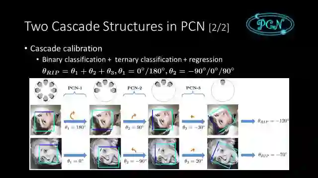 第二个级联结构是旋转角度的级联校准。PCN的级联校准属于一种由粗到精的级联回归模式,与人脸特征点估计、人体姿态估计思想类似。人脸的旋转角度等于三级网络预测结果之和。