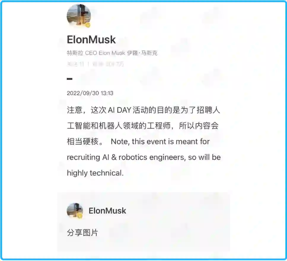 AI Day前一天,马斯克在社交媒体上称:这次AI DAY活动的目的是为了招聘人工智能和机器人领域的工程师,所以内容会相当硬核。