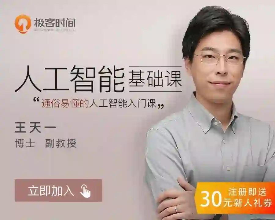 工学博士、副教授王天一在他的《人工智能基础课》里,会带你巩固人工智能基础,梳理人工智能知识框架,了解人工智能的最佳应用场景。新注册用户,立减30元。欢迎点击图片试读。