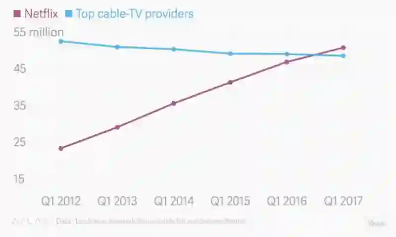 2017 年:Netflix 用户的数量超过了美国有线电视用户的总数。