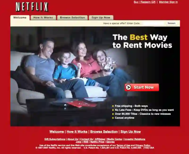2007 年:Netflix 推出其在线流媒体服务,Watch Now。该服务包含 1000 部电影,并且免费包括在 Netflix 每月 5.99 美元的实体 DVD 订购价中。
