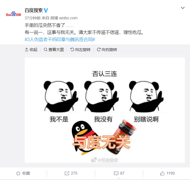 36氪获悉,就网传“腾讯状告老干妈拖欠广告费提及某搜索引擎”一事,百度7月1日下午发布微博称,“手里的瓜突然不香了……有一说一,这事与我无关。请大家不传谣不信谣,理性吃瓜。”