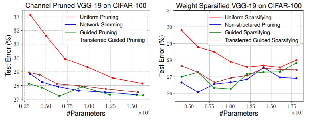 如果自动发现的架构参数效率更高,研究者可能会想:可以从中得出如何设计更好架构的普遍原则吗?为解答该问题,我们分别对 Network Slimming 和非结构化剪枝进行了两次实验,使用的数据集分别是 VGG-19 和 CIFAR-100。