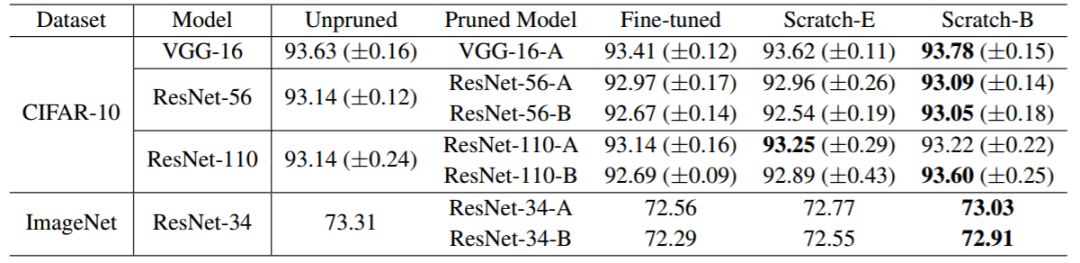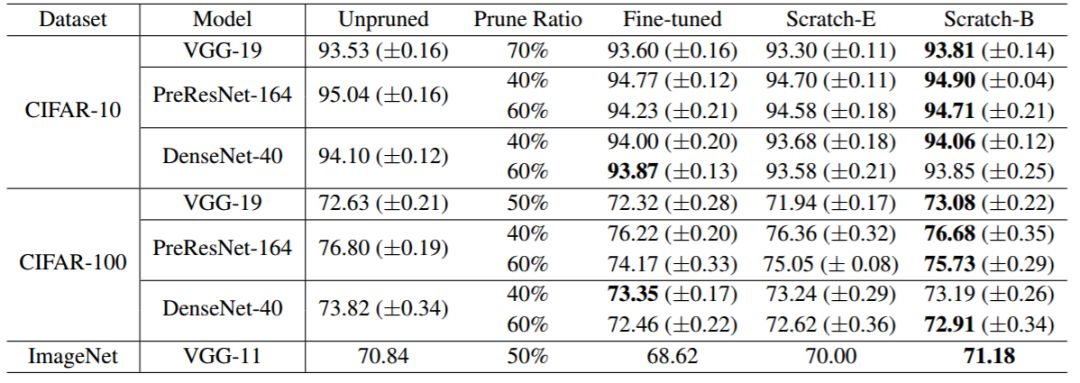 这一观察结果表明,对于这些剪枝算法而言,重要的是获得的网络架构而不是保留的权重,尽管这些目标架构还是需要训练大模型才能获得。我们的结果和文献中结果的矛盾之处在于超参数的选择、数据增强策略和评估基线模型的计算力限制。