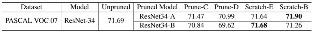表 7:剪枝在检测任务上的(mAP)结果。剪枝后的模型来自于 Li et al. (2017)。Prune-C 指在分类预训练权重上剪枝,Prune-D 指在迁移至检测任务之后的权重上进行剪枝。Scratch-E/B 表示从头开始在分类任务上预训练剪枝后的模型,然后迁移至检测任务。