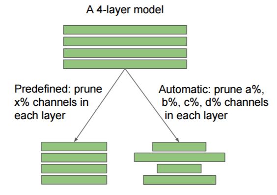 图 2:预定义和未预定义(自动发现)的目标架构之间的区别。稀疏度 x 是用户指定的,a、b、c、d 由剪枝算法决定。