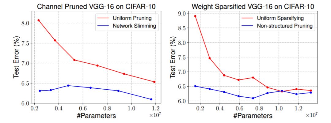 图 3:不同方法的剪枝后架构,所有模型都是从头训练的,平均运行 5 次。自动剪枝方法(左:Network Slimming (Liu et al., 2017),右:非结构化剪枝 (Han et al., 2015))获得的架构比在整个网络中均匀修剪通道或稀疏权重的方法具备更高的参数效率。