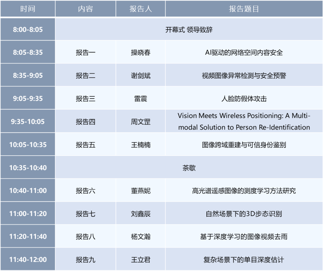 讲者简介:谢剑斌,国防科技大学教授,中北大学特聘教授。新加坡国立大学访问学者,国际 IEEE 会员,计算机学会会员,中国图象图形学学会会员,电光与控制编委会委员,国家边海防建设委员会委员,全国安防科技委委员,中国生物特征识别国家标准组专家,公安部 TC100 专家。32年来一直从事视觉计算理论和技术研究,针对军队、武警和公安部的重大需求,紧紧围绕边境防控、反恐预警、反谍保密、公共安全和应急管理,面向大数据和视觉物联网,研究海量视频分析与生物特征识别的难题,为军事重地、政府机关、金融场所等高等级安全领域提供特别可靠的身份识别和安全预警方法。包括:静脉特征识别、监控人脸识别、异常行为识别、视觉大数据搜索、自主高清摄像、要地无人看守、特种视频显控等。主持和参与反恐、反谍、反台独、载人航天、数字电视、新型战斗机、平安城市、天网工程、智慧城市、无人系统等国家重大课题,其中国家级项目 9 项、部委级项目 31 项、军民融合项目 41 项,注重实战,积极实践军民融合,合作支持的 21 家科技企业中有 7 家已经上市。发表学术论文 120 多篇,出版学术专著 10 部,申报国家专利 100 多项,授权发明专利 56 项、实用新型 37 项。荣获国际发明展金奖 3 项、全国发明展金奖 4 项、湖南省科技进步二等奖 1 项、公安部技术革新特别项目奖 2 项,荣获中国发明创业奖·人物奖、湖南省十大优秀发明人奖。