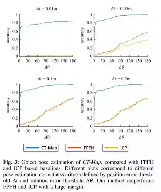 图3.与基于FPTH和ICP的基线比较的CT-Map的目标姿态估计。不同的图对应于由位置误差阈值∆t和旋转误差阈值∆θ定义的不同姿态估计正确性标准。我们的方法比FPTH和ICP有很大的优势。