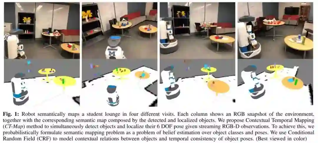 图1.机器人在四次不同方向中对学生休息室进行语义建图。每列显示环境的RGB简照,以及由检测到的和定位到的物体组成的相应语义地图。本文提出了一种时间一致性地图(CT-MAP)的方法,在一系列RGB-D观测的情况下,同时检测目标并定位其6自由度姿态。为了实现这一点,本文将语义建图问题表示为对物体类别和姿态的概率性估计问题。使用条件随机场(CRF)来模拟物体之间的上下文关系和物体姿态的时间一致性。