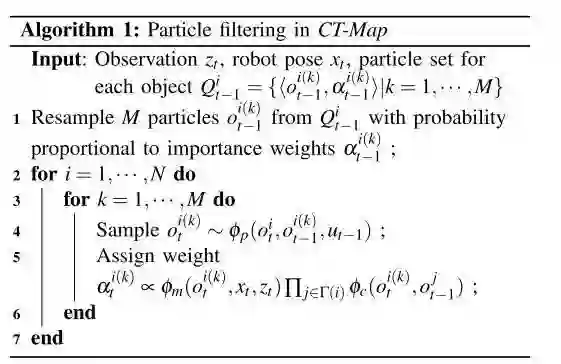 本文提出一种基于滤波器的语义地图构建方法,可以同时检测物体和六个自由度的定位。我们的方法称为上下文时间一致性地图(CT-Map),我们根据观测的场景在语义地图上设置物体类别和姿态。然后以条件随机场(CRF)的形式模拟语义地图推断问题。CT-Map是一种CRF,考虑两种形式的关系潜力来解释物体之间的背景关系和物体姿态的时间一致性,以及观察的测量潜力。然后提出粒子滤波算法在CT-Map模型中执行推断。我们在配备了RGB传感器的密西根进度提取机器人上验证了CT-Map方法的有效性。本文的结果表明相对于将观测值视为场景中独立样本的基线方法,基于粒子滤波的CT-Map推断提供了更好的目标检测和姿态估计。