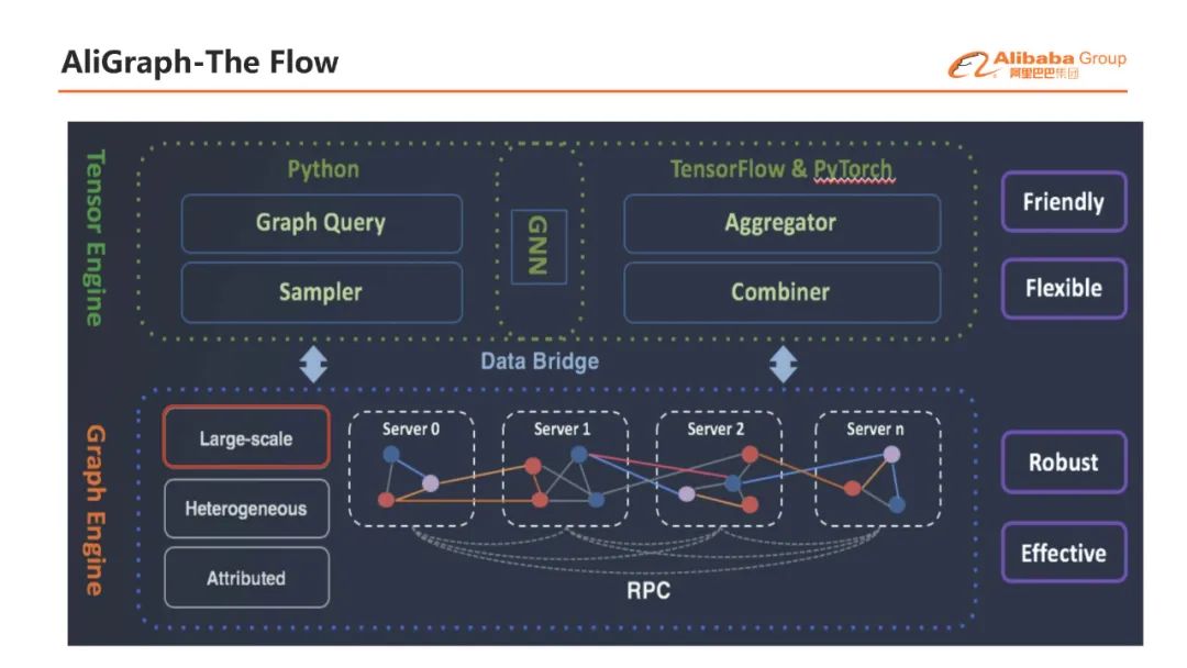 另一方面,工业场景中的Graph数据十分复杂,而且数据量巨大。平台不能脱离场景而独立存在,必须以业务为驱动,才最可能孵化出有实际价值的产品。以阿里巴巴的电商推荐场景为例,每天的产生的图数据多达几百TB,而且高度异构(多种类型的顶点、多种类型的边),顶点和边具有丰富的属性,诸如商品的名称、类目、价格区间,甚至是其关联的图像、视频等,这些属性以明文存在而非已经向量化好的结构化信息。以这样的数据为输入,如何高效的进行GNN训练是一个非常有挑战的问题。如果使用数据预处理、预训练等手段把Graph数据结构化、向量化,会耗费大量的计算资源、存储资源和人力成本。真正对GNN开发者友好的平台,应该是端到端的,在一套IDE里,用户既可以操作复杂的Graph数据,又可以将数据与深度神经网络对接,自由编写上层模型。平台提供简单灵活的接口,满足GNN高速发展所需的可扩展性与生态的兼容性,和针对复杂的分布式环境的大规模与稳定性。