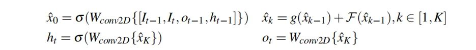 为解决上述问题,作者提出了一种新颖的递归网络RRN(Residual Recurrent Network),它将残差学习思想引入到RNN中。这种设计确保了流畅的信息流,有助于保持长周期的纹理信息,进而使得RNN可以处理更长序列,同时降低了训练过程中的梯度消失风险。在t时刻,RNN采用如下方式生成隐状态与输出: