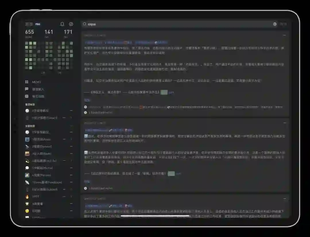 Flomo 的 UI 配色、间距都非常统一,每一条内容就是一张精美的小卡片,用它写作有一种极强的沉浸感。于是我开始用它来记录自己每一个时刻迸发的想法、摘录和批注在少数派读到的受启发的内容(如图);接着对它进行批注,以及记录思考后的链接卡片。整个使用过程中没有任何规则和冗长的教学来约束我「应该如何去用一款笔记 app」,仿佛在写朋友圈,简单而便捷。