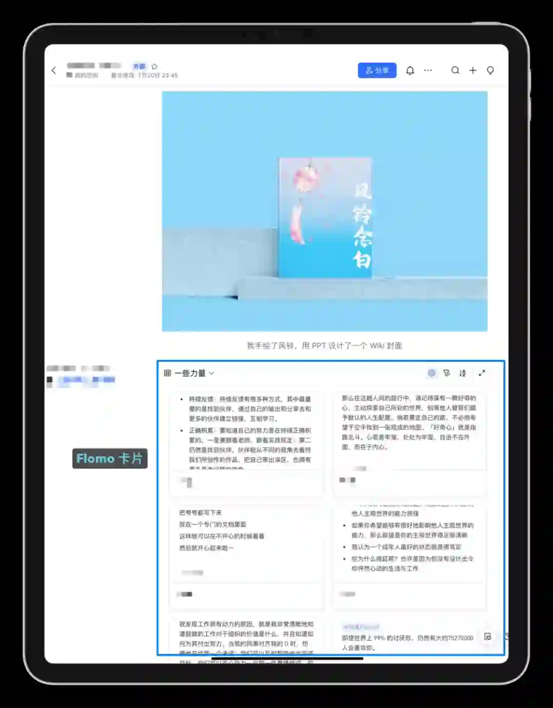 最近帮助小伙伴晓玲给她的飞书 Wiki 知识库起了一个名字,用来沉淀很多有价值的沟通内容。我当时秉着对设计创作工作的责任感和热爱,甚至设计了 Wiki 书封,并在 Flomo 里起草,写下了名字背后的价值和内涵。有一层是:我认为每个人都会有这一刻,内心处于腐蚀的状态。即便是那些常常带给我们快乐的人,也可能在某个角落,暗自应付蚕食内心的幽灵。所以我们需要相互搀扶、相互鼓舞。每一次谈心,每一份问候,每一段对话——都是赠予的能量。不妨把它们记录下来吧,在未来的某一个关键时刻,它们将汇聚成无穷的力量,仿佛所有之前在你身边说那句话的人,都在此时来到身边陪伴着你。